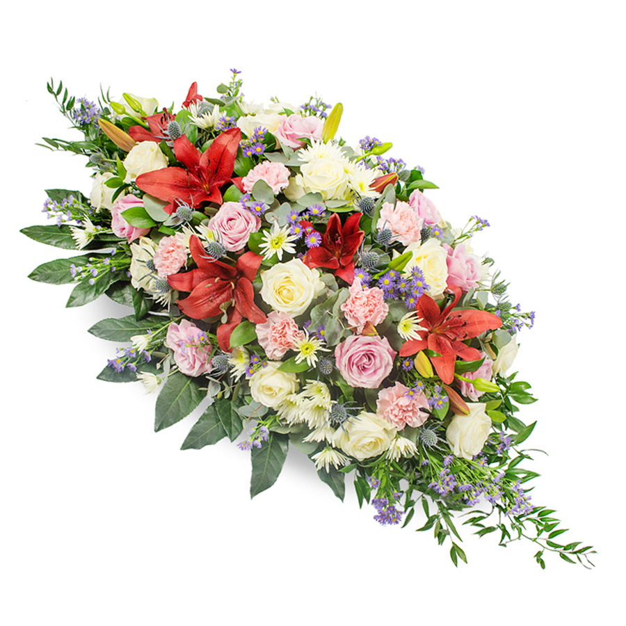 Honor a cherished memory with our timeless casket spray, featuring a vibrant selection of fresh flowers. This elegant arrangement showcases pink and white roses, red lilies, and white chrysanthemums, beautifully complemented by rich greenery.