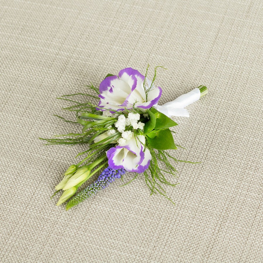 Enhance the groom's look with our Lilium & Lisianthus Groom Buttonhole. This delightful arrangement features a captivating combination of white-purple lisianthus, enchanting purple veronica, delicate gypsophila, and verdant aralia leaves. Each flower is hand-selected to ensure exceptional freshness and quality, providing a unique and stylish accessory for any groom.