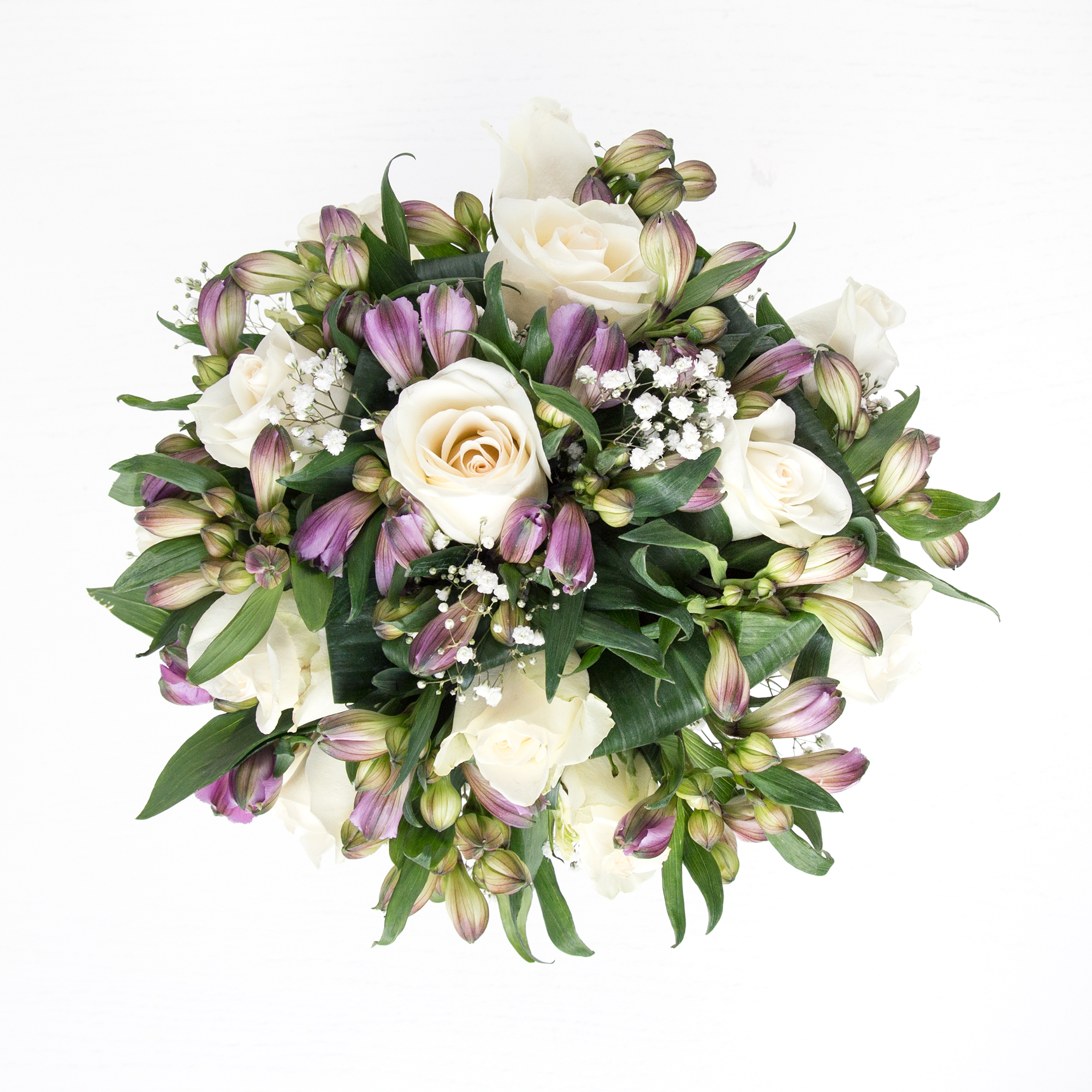 Illuminate any space with our radiant bouquet, featuring the delicate charm of cream ivory roses and the striking presence of royal purple alstroemeria, accented by white gypsophila and vibrant aspidistra leaves.