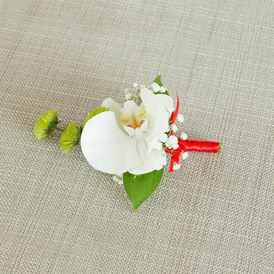 Make a lasting impression with our exquisite groom buttonhole, the perfect finishing touch to any groom's attire. This stunning arrangement features a harmonious blend of white orchids, green mini chrysanthemums, and delicate gypsophila, meticulously tied together with an elegant red ribbon.