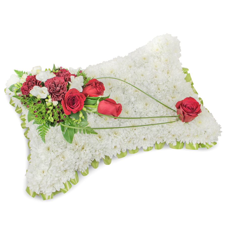 Convey your heartfelt condolences with our heartfelt condolence arrangement, featuring a unique selection of white chrysanthemums, red roses, white freesias, dark red carnations, dianthus, and bear grass. Each flower is hand-picked to ensure freshness and superior quality.